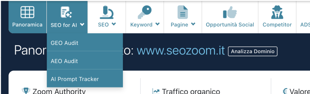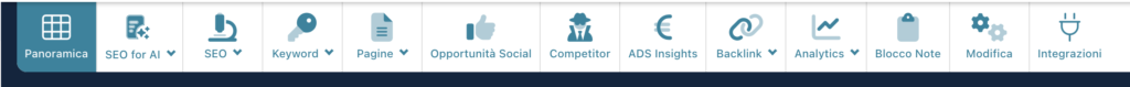 La barra di navigazione in alto ti attraverso tutte le aree di analisi collegate al sito che hai inserito nel progetto. Ogni sezione approfondisce un aspetto specifico del dominio e raccoglie dati aggiornati che puoi leggere in modo coerente: puoi valutare il comportamento complessivo del dominio all’interno dei motori di ricerca tradizionali e generativi, interpretare gli specifici segnali GEO, leggere i dettagli del rendimento SEO e analizzare le campagne Google Ads rilevate.