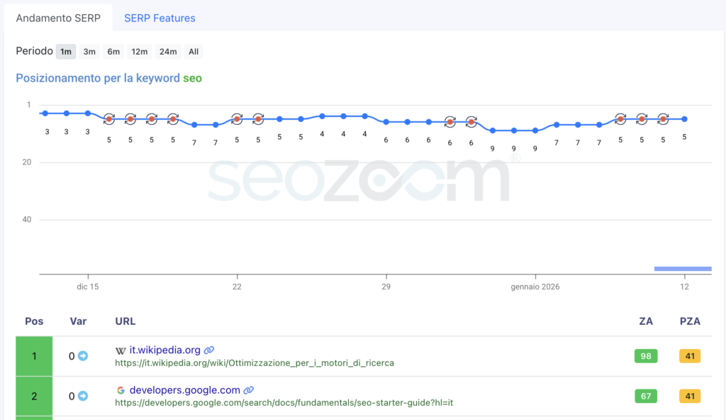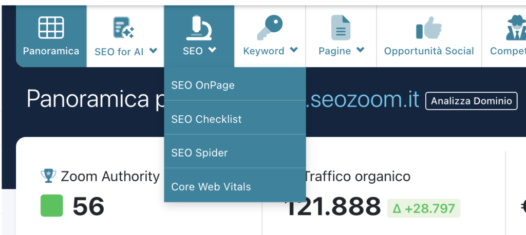 • Zoom Authority (ZA). La metrica proprietaria di SEOZoom che misura l’autorevolezza complessiva del tuo sito su Google, in una scala da 0 a 100. Si basa su elementi oggettivi e non manipolabili.