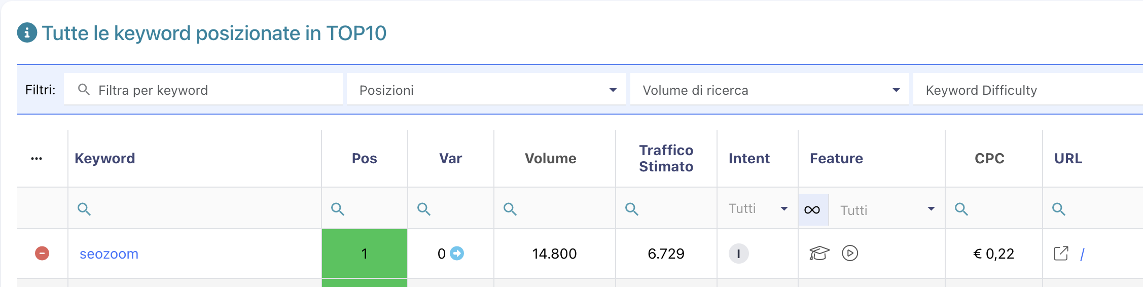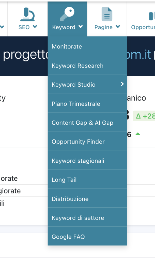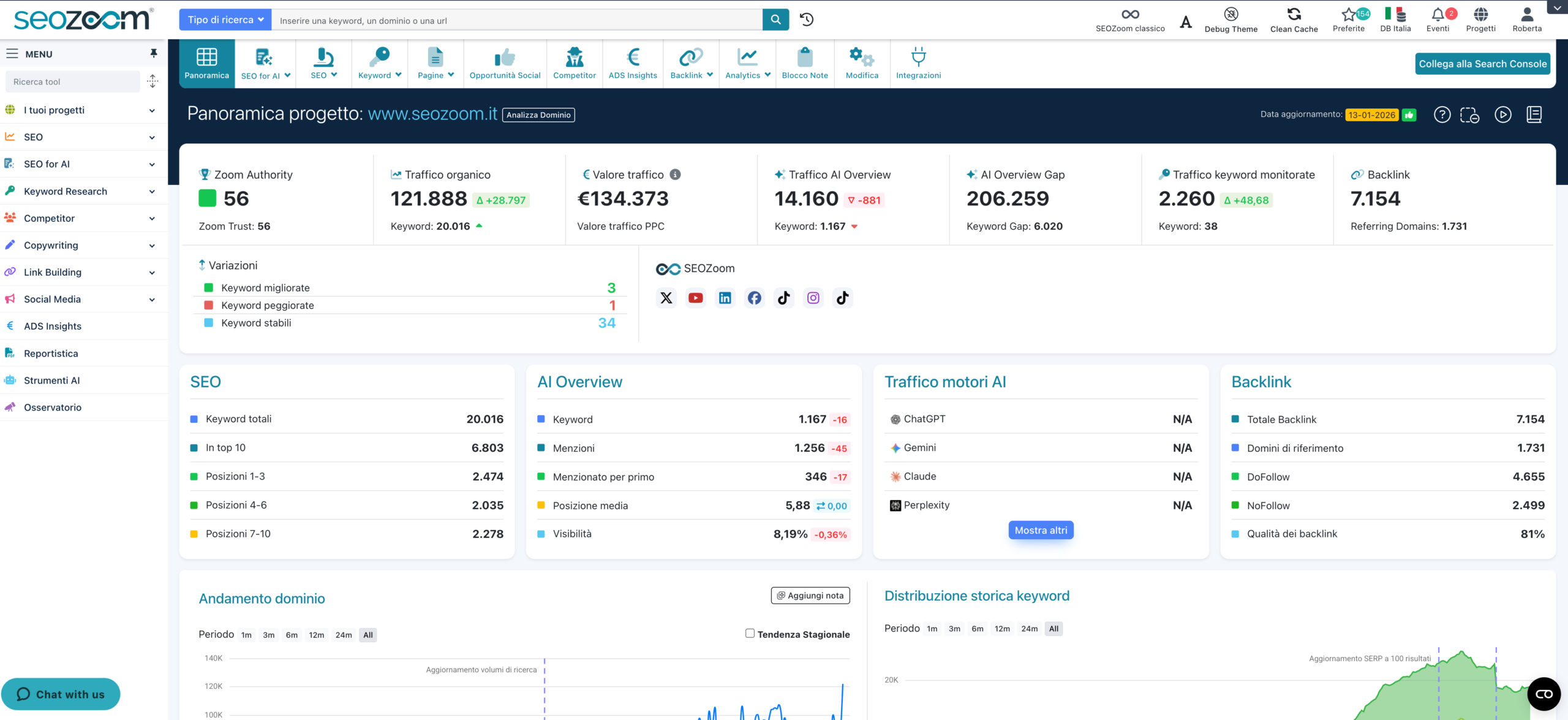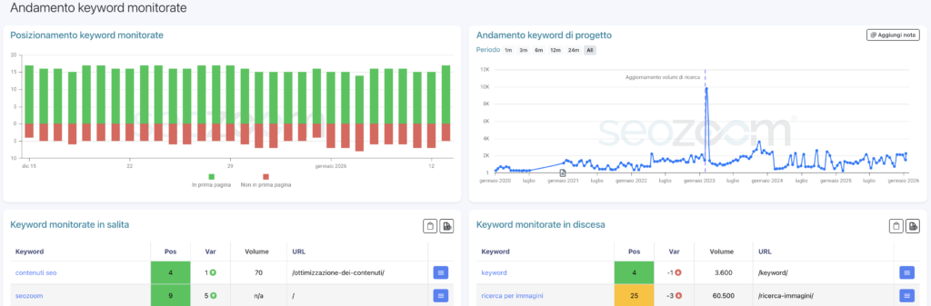 Il progetto è lo spazio in cui SEOZoom raccoglie tutte le informazioni su un sito web e ti restituisce i dati più aggiornati su traffico, keyword, rendimento delle pagine, competitor, opportunità e KPI di visibilità.