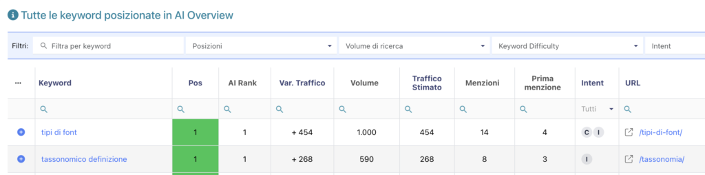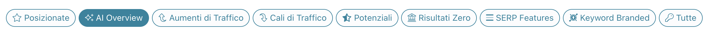 • AI Overview mostra l’elenco completo delle keyword per cui il sito ottiene una menzione nelle risposte generative di Google AI. È una panoramica preziosa per capire su quali argomenti il tuo brand è già riconosciuto come fonte autorevole dalle intelligenze artificiali, e come la visibilità organica stia evolvendo verso il nuovo scenario dei motori conversazionali.