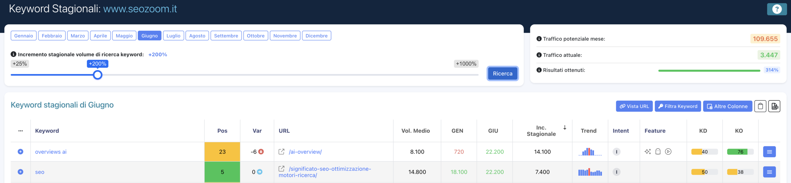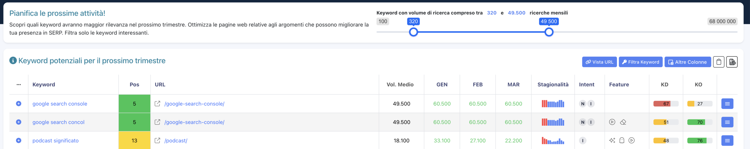 Segue un blocco con Andamento annuale, per confrontare i valori stimati attuali con quelli precedenti (3, 6, 9 e 12 mesi prima); Distribuzione keyword per pagina per capire, grazie al grafico a colonne, quante query presidiano la prima pagina di Google e quante restano oltre la terza; Piano trimestrale, per conoscere le pagine già presenti in SERP che intercettano keyword destinate a crescere nei prossimi mesi – un invito a rafforzare prima i contenuti esistenti, migliorandoli in tempo per intercettare la domanda futura.
