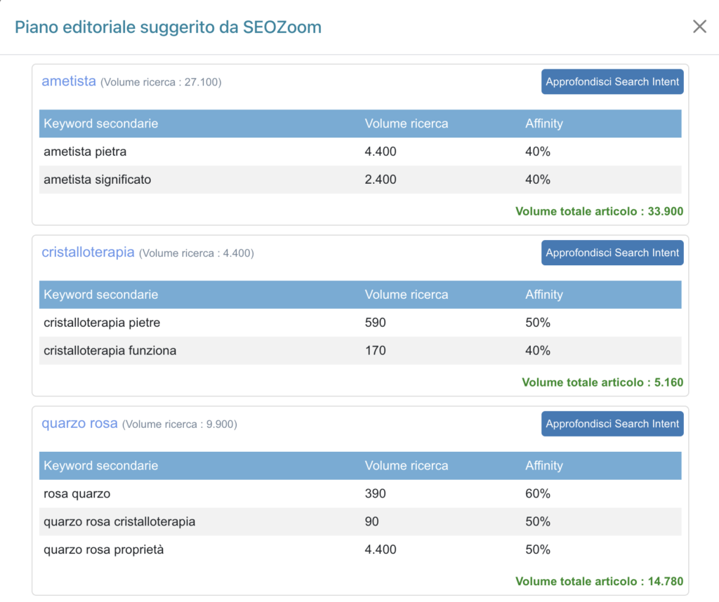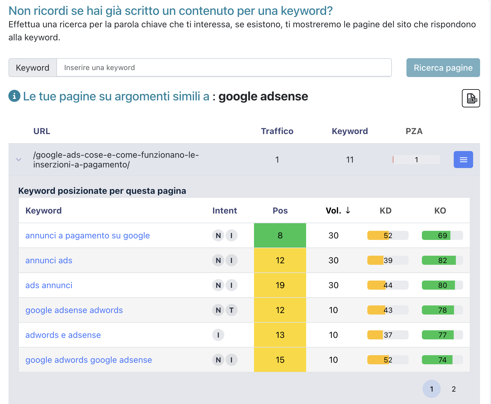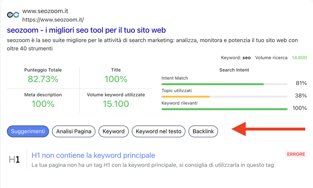 Dopo una scansione approfondita di tutte le pagine del progetto, lo strumento ti mostra per ogni URL qual è la sua “main keyword” secondo l’algoritmo di SEOZoom. Analizza quindi la presenza di questa parola chiave nei punti strategici della pagina (URL stesso, title, heading) e valuta la coerenza tra la struttura, il contenuto e l’intento della query. Il risultato non è solo un dato, ma un’indicazione operativa: l’algoritmo ti suggerisce se è il caso di migliorare la pagina per allinearla meglio alla sua keyword principale, o se invece conviene creare un nuovo contenuto più specifico per intercettare meglio quella query, evitando così di avere una pagina troppo generica.