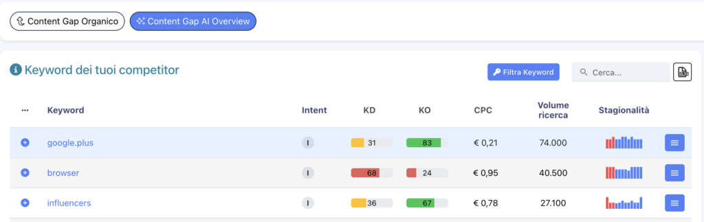 • AI Overview Gap ti fornisce subito un piano d’azione per conquistare visibilità: qui vengono elencate le keyword per cui i competitor appaiono nelle risposte AI, ma il tuo sito no. Usalo per individuare opportunità di contenuto e per colmare le lacune che limitano la tua presenza nei risultati generativi.