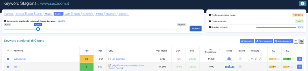 Il blocco Previsione traffico confronta l’andamento degli ultimi dodici mesi con quello previsto per i successivi dodici, mostrando per ogni mese la variazione attesa se i posizionamenti restassero invariati.
