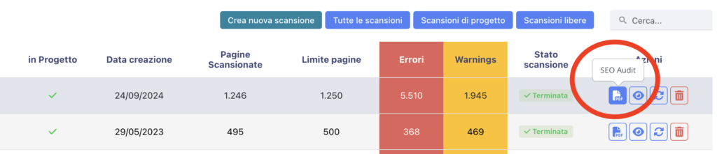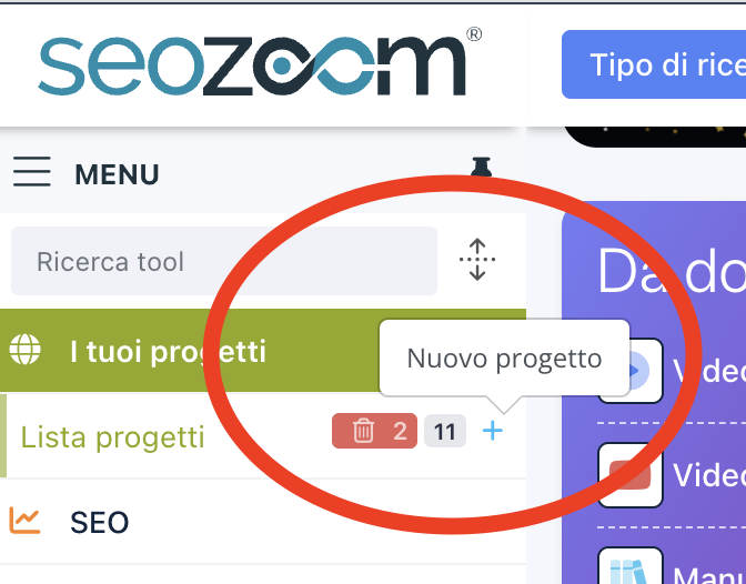 1. Avvio. Puoi creare un nuovo progetto in diversi modi: cliccando sul tasto + nella sezione “Progetti” della colonna a sinistra, dal menu “Progetti” nella barra in alto, oppure dal bottone dedicato che trovi quando analizzi un qualsiasi dominio sulla piattaforma.