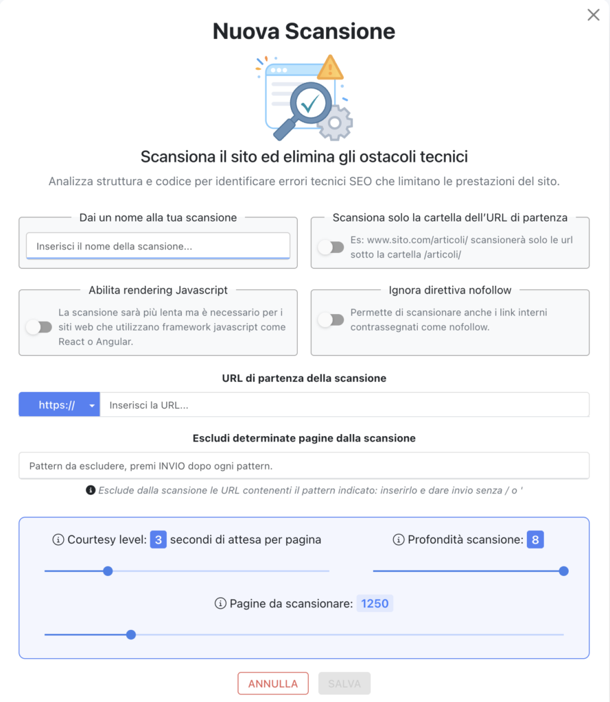 Se il tuo sito ha aree tematiche ben distinte – come un blog, un ecommerce o aree in lingue diverse – lo strumento Sezioni ti permette di analizzarle separatamente, come se fossero dei “micro-progetti” all’interno del progetto principale.