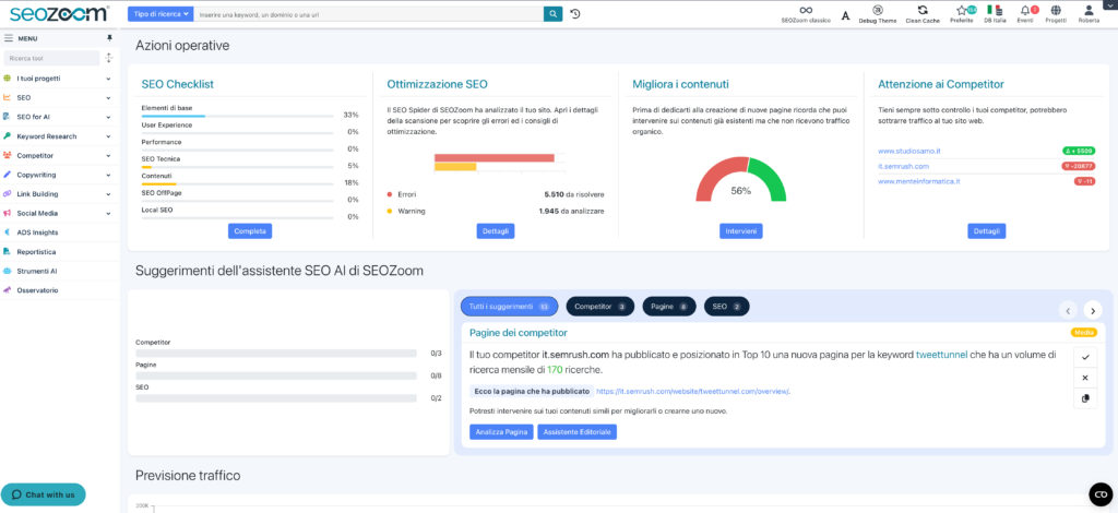 • Azioni operative. La sezione Azioni operative raccoglie le attività concrete da svolgere: qui SEOZoom traduce i dati in compiti concreti. SEO Checklist indica qual è il livello di completamento delle attività preliminari e operative sul tuo progetto, suddivise in aree base (dalla tecnica alla UX). Il riquadro di Ottimizzazione SEO riprende i dati dell’ultima scansione del SEO Spider, indicando errori e warning con link diretto al dettaglio, mentre Migliora i contenuti segnala le pagine che potrebbero essere arricchite o riviste. A completare il quadro, la sezione Attenzione ai competitor elenca i domini che stanno guadagnando terreno a scapito del tuo sito, aiutandoti a capire dove rischi di perdere terreno.