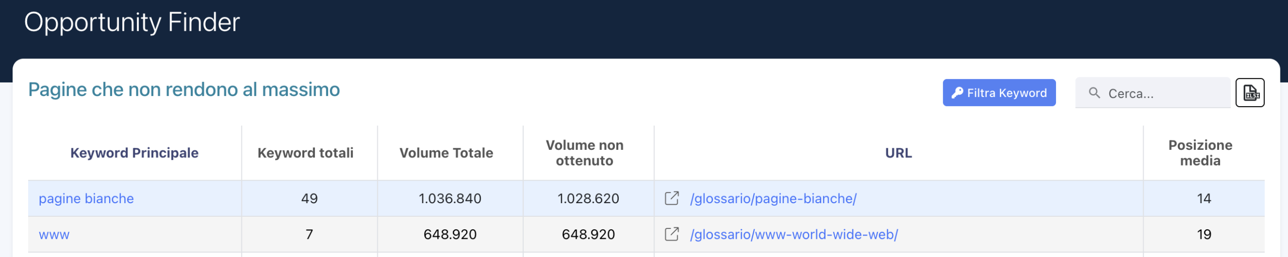Questa sezione è un acceleratore per la tua strategia SEO: individua e raggruppa tutte le pagine del tuo sito che hanno il più alto potenziale di crescita, ovvero quelle che possiedono già un buon numero di parole chiave posizionate nella seconda e terza pagina di Google. Si tratta di contenuti che Google considera già pertinenti, ma a cui manca una piccola spinta per fare il salto in prima pagina e iniziare a generare traffico significativo.