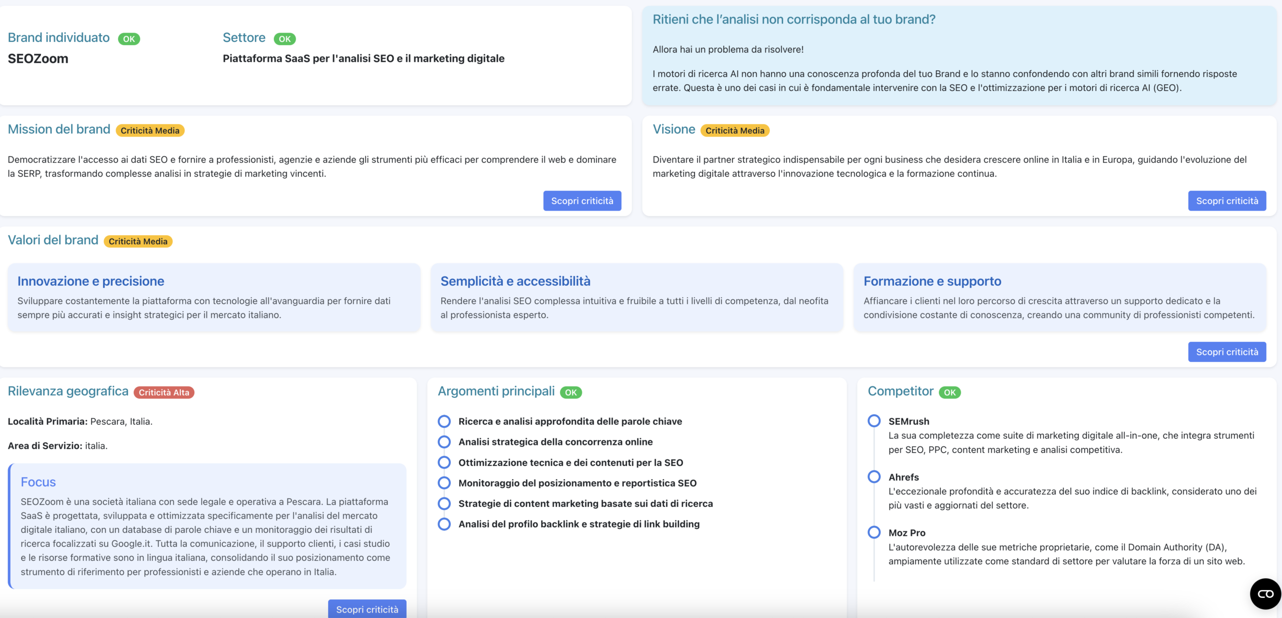 • Mission, Visione e Valori: qui il sistema confronta la tua comunicazione con la percezione dell’AI. Se l’AI non trova dichiarazioni esplicite sul sito, tenta di dedurle o sintetizzarle. Una segnalazione di criticità indica che il messaggio non è chiaro e che i motori stanno “tirando a indovinare”, rischiando di fornire risposte errate agli utenti.