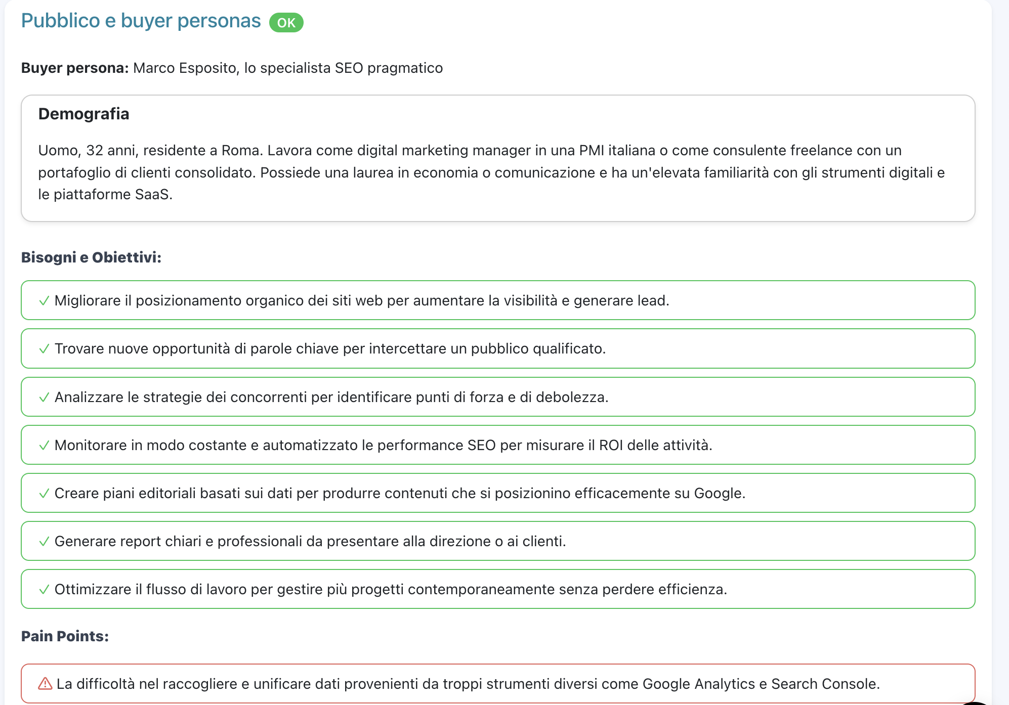 La sezione Buyer Personas traccia l’identikit del tuo cliente ideale basandosi sul tuo stile comunicativo. Se il profilo rilevato (demografia, bisogni, pain points) non corrisponde al tuo target reale, hai un’indicazione chiara per ricalibrare il tono di voce dei contenuti.