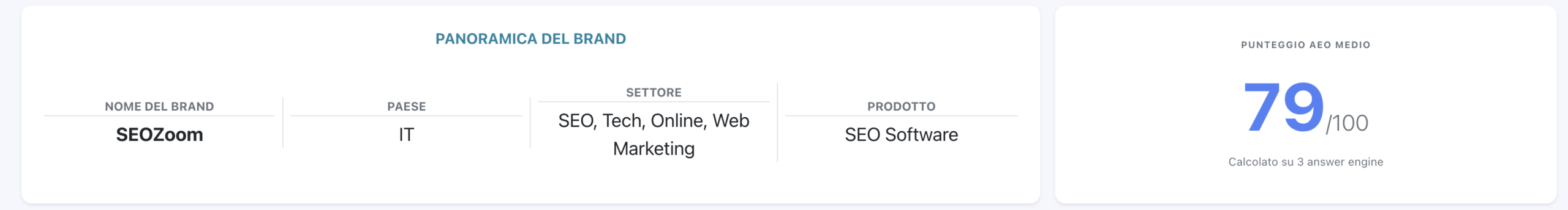 Il primo box che vedi è la Panoramica del brand, che riporta i parametri che hai impostato al lancio dell’analisi – nome, Paese, settore e tipologia di prodotto o servizio. Questi dati vengono utilizzati per costruire il prompt con cui gli Answer Engine vengono interrogati; in pratica, stai dicendo all’AI da quale angolazione guardare il brand e quali aspetti privilegiare nella valutazione.