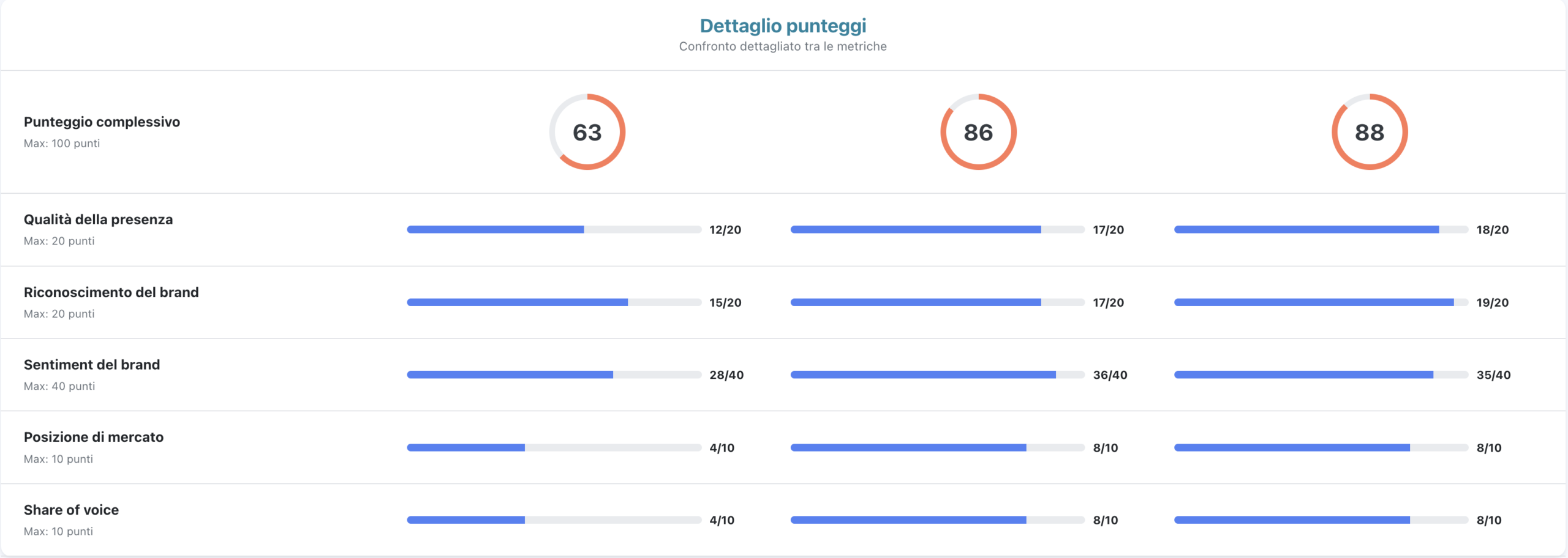 “Dettaglio Punteggi” trovi la prima profilazione strategica. Questa sezione serve a spiegare il “perché” del tuo punteggio attraverso metriche che valutano la salute del brand; qui puoi capire se la tua presenza è tecnicamente valida (Qualità della presenza), quanto il marchio è noto ai modelli (Riconoscimento del brand) e, soprattutto, qual è la percezione emotiva che susciti (Sentiment). A questi si affiancano i dati sulla tua forza competitiva, che indicano quanto spazio occupi nel mercato rispetto agli altri attori.