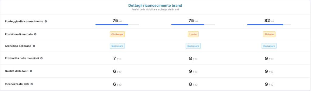In Dettagli riconoscimento brand l’analisi diventa profilazione. L’intelligenza artificiale assegna al tuo brand un ruolo specifico nel mercato (ad esempio “Leader” o “Challenger”) e un archetipo che ne definisce la personalità percepita (come “Innovatore” o “Tradizionalista”). È un feedback essenziale per verificare se l’identità che stai comunicando viene recepita correttamente. Inoltre, i dati sulla profondità delle menzioni e sulla qualità delle fonti ti dicono quanto è solida l’informazione che l’AI possiede su di te: più alti sono questi valori, più è difficile che il tuo brand venga rimosso dalle risposte future.