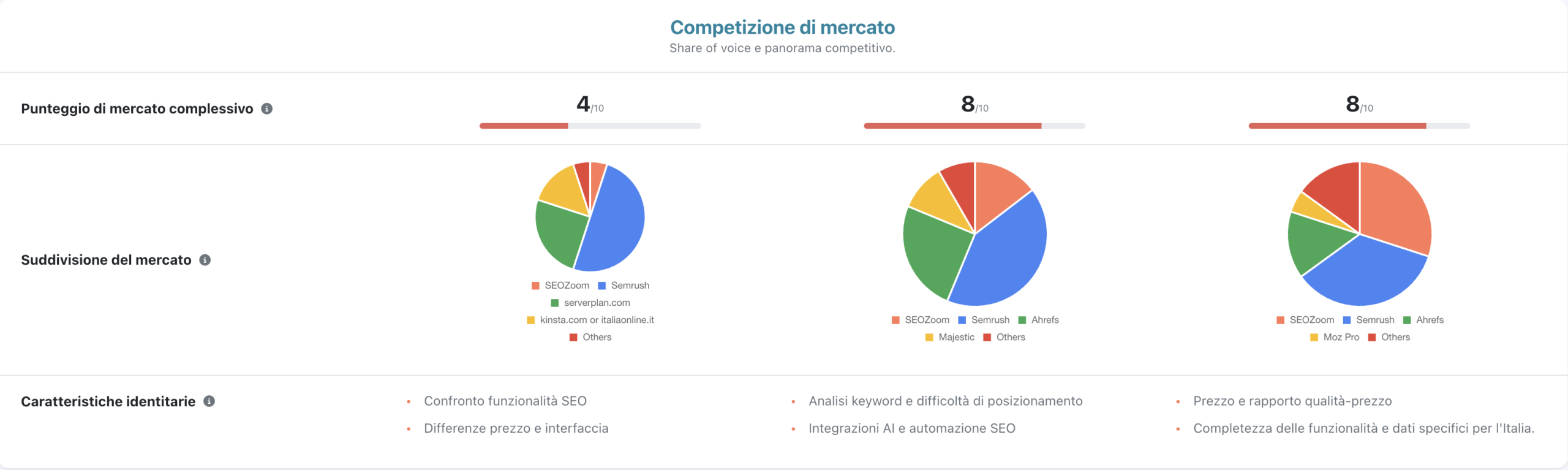 L’area Competizione di mercato offre il confronto visivo diretto con i concorrenti che l’AI ha “abbinato” al brand che stai analizzando. Attraverso i grafici a torta, vedi esattamente la tua Share of Voice, la fetta di visibilità che detieni nelle risposte generate rispetto ai competitor monitorati. Immediatamente sotto, trovi le Caratteristiche Identitarie, l’elenco degli attributi che l’AI associa spontaneamente al tuo nome, per capire se sei posizionato genericamente o se l’AI ha colto le specificità uniche del tuo servizio.
