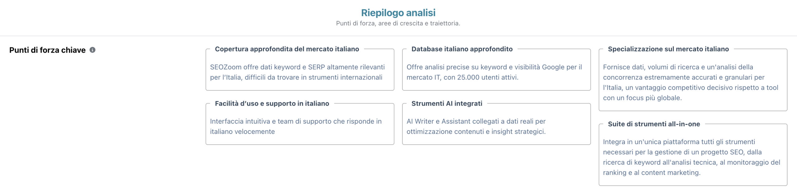 Proseguendo la lettura trovi il “Riepilogo analisi”, la sezione più operativa dell’audit, dove l’AI agisce come un consulente strategico. È una diagnosi discorsiva che mette in luce i tuoi punti di forza consolidati e le aree di crescita, ovvero le opportunità mancate che richiedono intervento. Molto importante è la lettura della Traiettoria di mercato, una proiezione che ti indica se il trend della tua visibilità è in ascesa, stabile o in calo, permettendoti di valutare l’efficacia delle tue azioni recenti nel medio periodo.