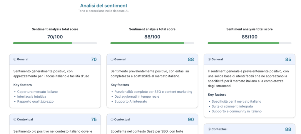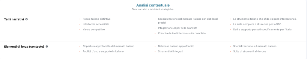 In Analisi contestuale l’indagine si sposta sulla narrazione. Il sistema scompone il discorso attorno al tuo brand per individuare i temi ricorrenti e gli elementi strutturali che sostengono la tua reputazione. Questa vista ti aiuta a capire se vieni citato per gli argomenti corretti (coerenti con il tuo business core) o se la discussione si sta spostando su temi marginali che diluiscono la tua autorità tematica.