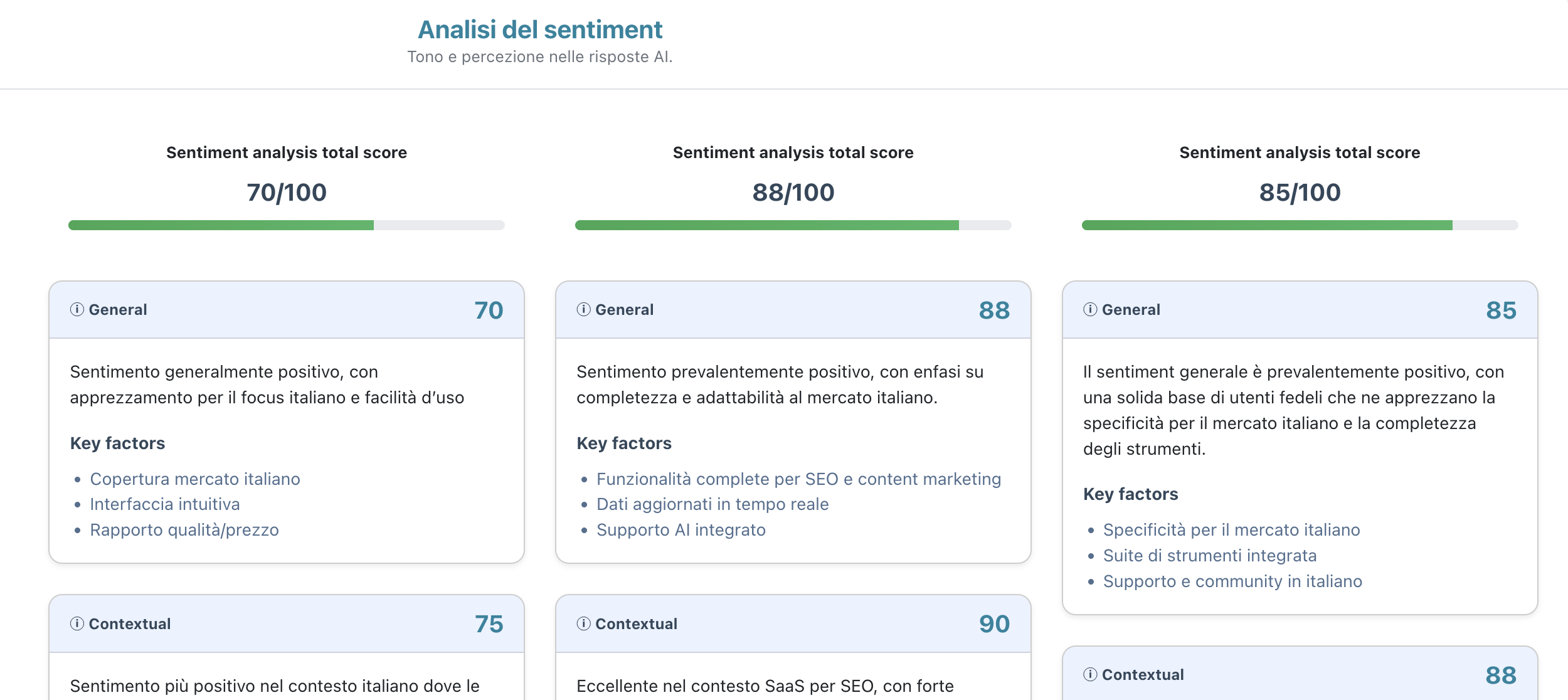 Argomenti Principali elenca i concetti per cui l’AI ti ritiene un “esperto” , mentre l’Analisi del Sentiment misura la reputazione del brand estraendo le keyword emotive ricorrenti dai contenuti online.