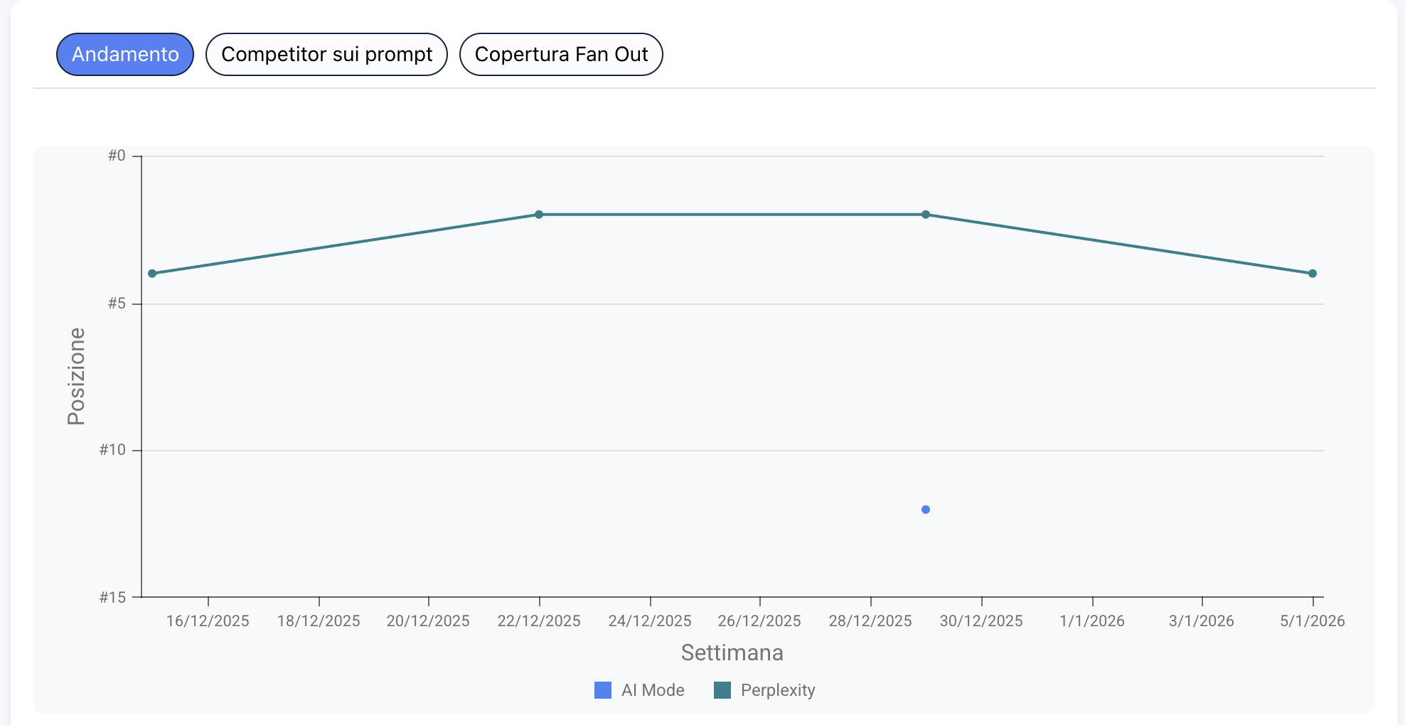 L’analisi resta salvata nella memoria del tuo account: non perdi i dati chiudendo la finestra e puoi consultare lo storico di tutte le indagini effettuate direttamente dalla AI Dashboard. Poiché la percezione dell’AI cambia nel tempo, ti suggeriamo di lanciare periodicamente un aggiornamento del report per verificare lo stato del tuo lavoro; trattandosi di una nuova interrogazione in tempo reale, l’aggiornamento comporta il costo di una nuova generazione (0,50€).