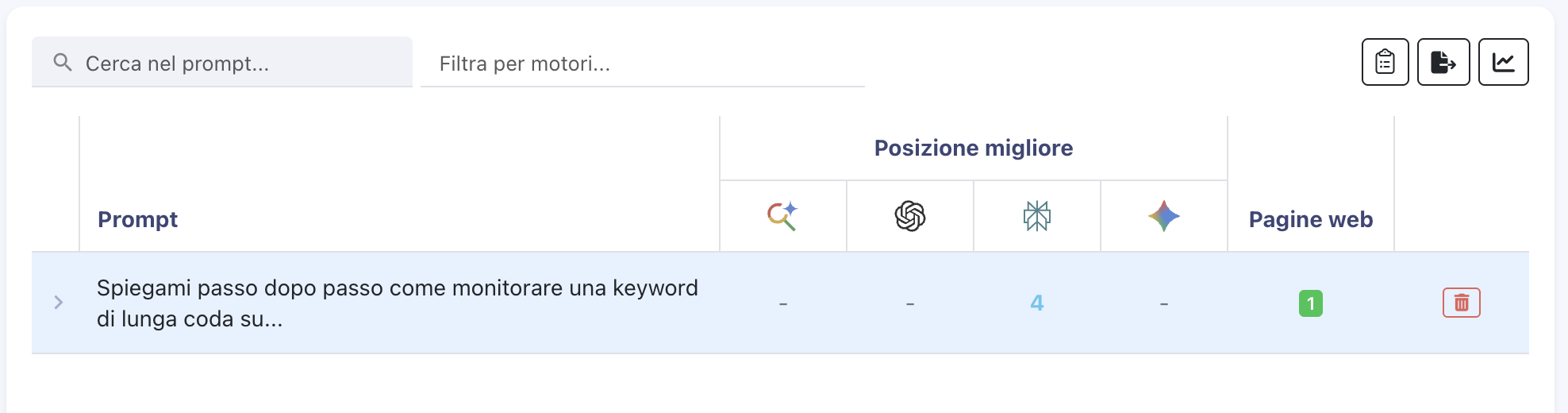 AI Prompt Tracker è lo strumento che ti permette di monitorare la tua visibilità all’interno delle risposte generate dai Motori AI, andando oltre il classico posizionamento per keyword.