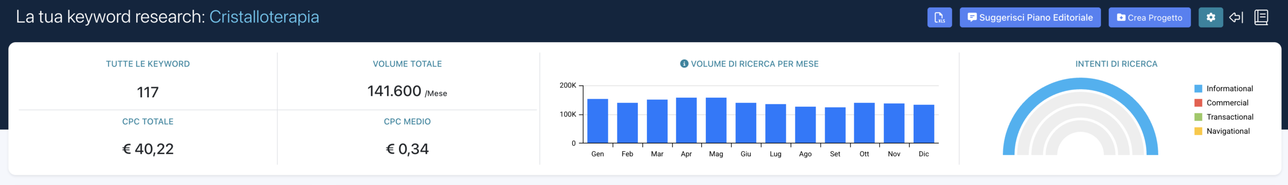 La Panoramica del progetto è un pannello di controllo. Leggendola dall’alto verso il basso ottieni un percorso completo: prima la sintesi dei KPI, poi l’approfondimento delle aree SEO e AI, gli andamenti storici, le previsioni, i suggerimenti e le azioni operative, fino ad arrivare alle keyword e alle pagine che ti indicano concretamente dove agire.