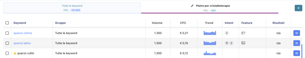 • Keyword: qui gestisci l’elenco delle parole chiave che hai deciso di monitorare ogni 24 ore. Puoi aggiungerne di nuove, rimuoverle, oppure organizzarle assegnando dei tag specifici. Da qui, inoltre, puoi usare SEOZoom come un semplice rank tracker: impostando una lingua, una nazione o una località specifica, otterrai solo il dato di posizionamento in quella SERP geolocalizzata, senza i volumi di ricerca.